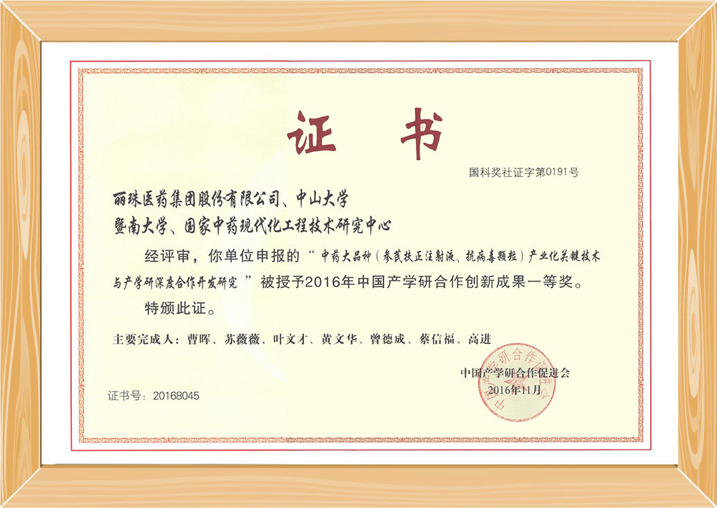 2001年,公司在行业率先提出“数字化中药”理念,建立了完整的数字化质量评估体系和一整套从原材料、中间体到成品的化学指纹图谱。2017年,历经十多年自主研发的参芪扶正注射液增加多层共挤输液用膜制袋包装(即袋装)补充申请获得国家食品药品监督管理总局批准。“参芪扶正注射液”是丽珠集团采用先进的数字化技术生产的首个中药注射剂。2004年列为“国家中药保护品种”;获“中国中西医结合学会科技进步一等奖”; 2007年入选“老百姓放心药”,2009年荣获广东省科技进步一等奖,2017年获国家科技进步二等奖。