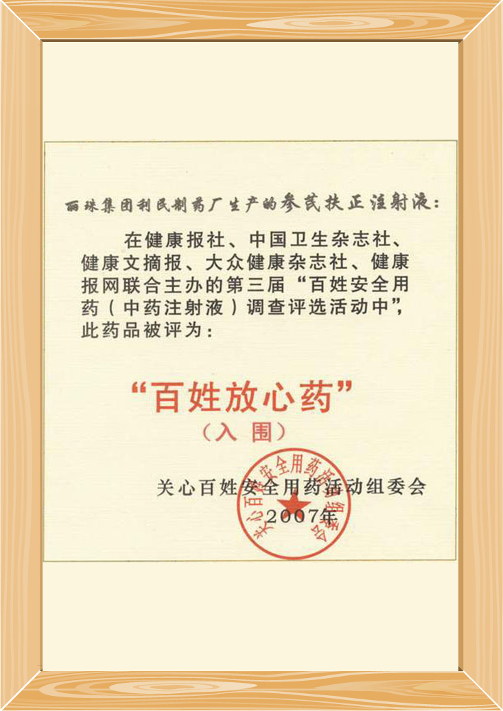 Shenqi FuZheng injection is a traditional Chinese medicine infusion solution produced with advanced digital technology. R&D on the drug began in 1985, and it was approved for production in 1999. In 2004, Shenqi FuZheng injection was protected by the regulations on traditional Chinese medicines, and won the first prize of the Scientific & Technological Award from the Chinese Association of the Integrative Medicine. In 2007, it was elected as a “Rest Assured Medicine”. It won the first prize of the Guangdong Scientific & Technological Progress Award in 2009, and the second prize of the National Scientific & Technological Progress Award in 2017.